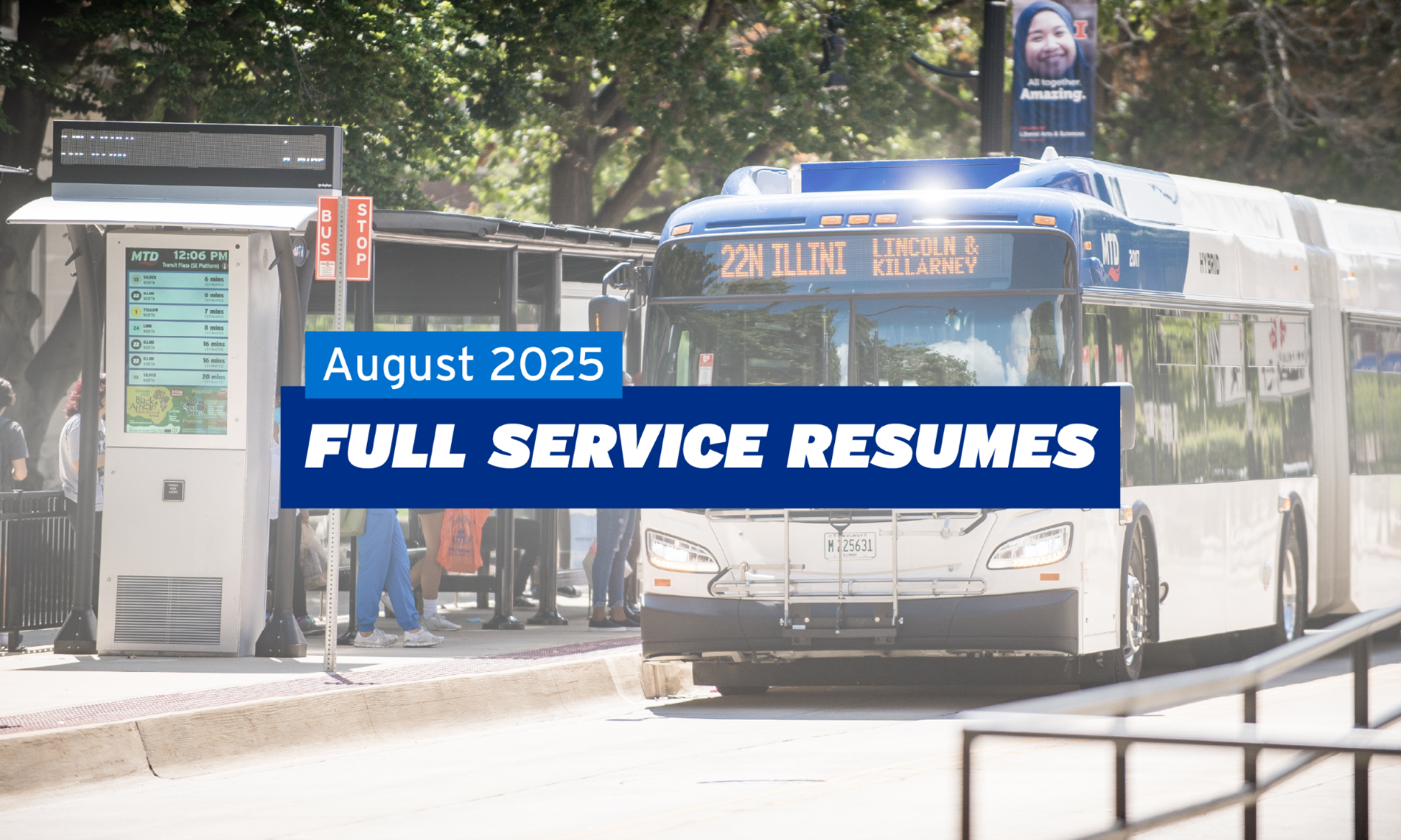 The Champaign-Urbana Mass Transit District (MTD) is thrilled to announce the final phase of service restorations, which go into effect at the start of service on Friday, August 23. This milestone marks a full restoration of MTD's pre-pandemic service levels.
